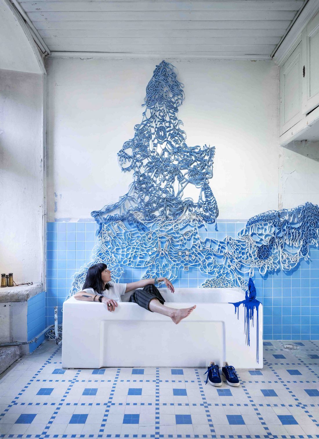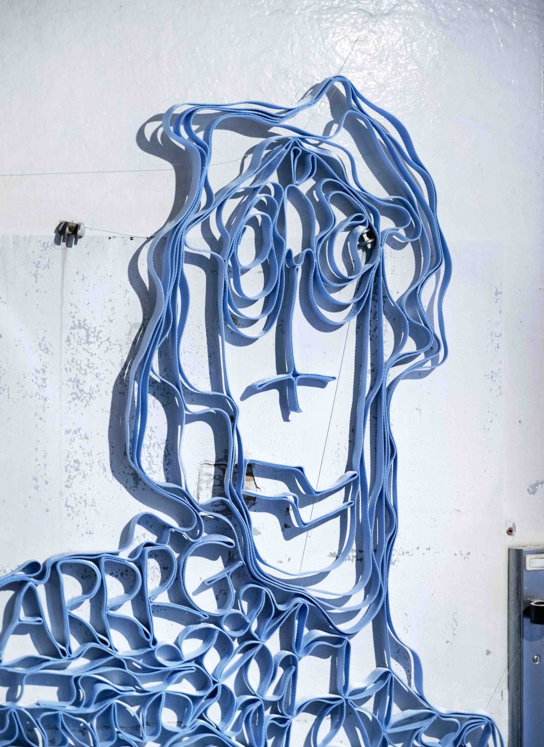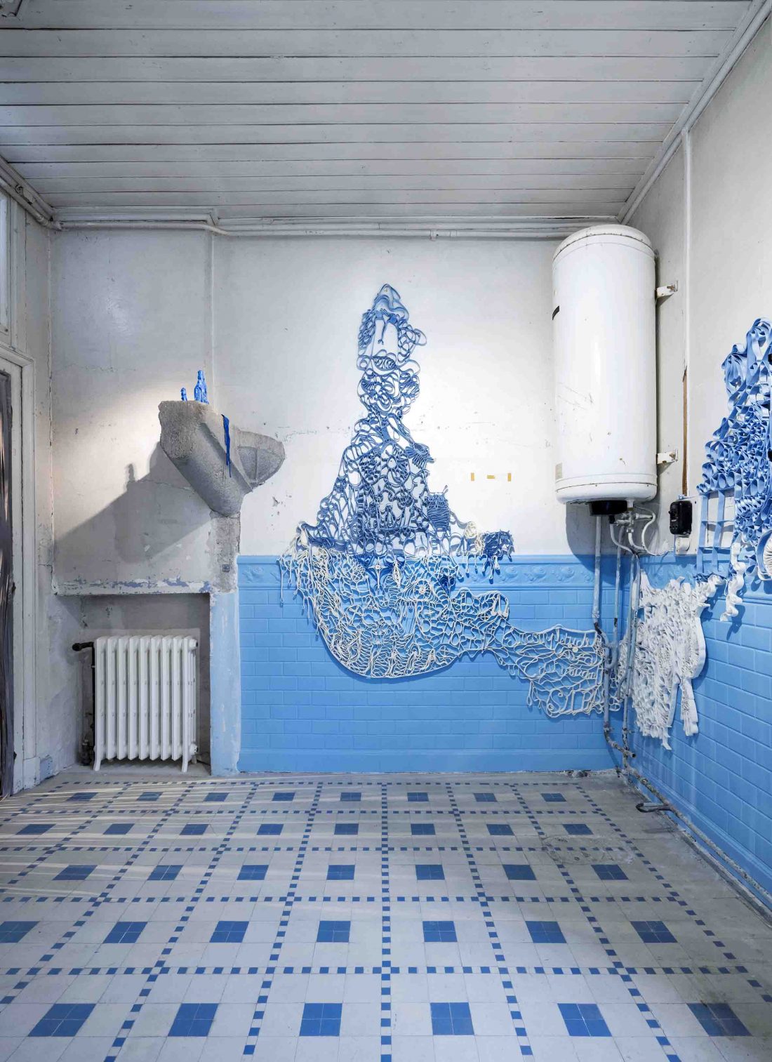 Pour l’exposition, j’ai ourlé et enroulé sur les murs laissés visibles des plis et replis de paperolles reliquaire en une matrice psychique à mémoires de formes où l’on peut reconnaitre corps, lettres, blagues. C’est presque moi.
