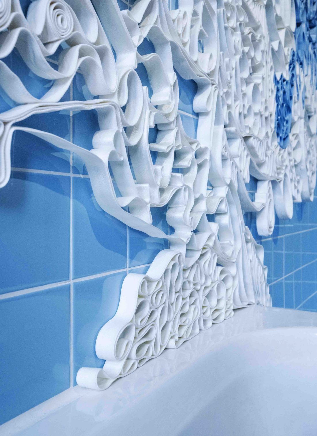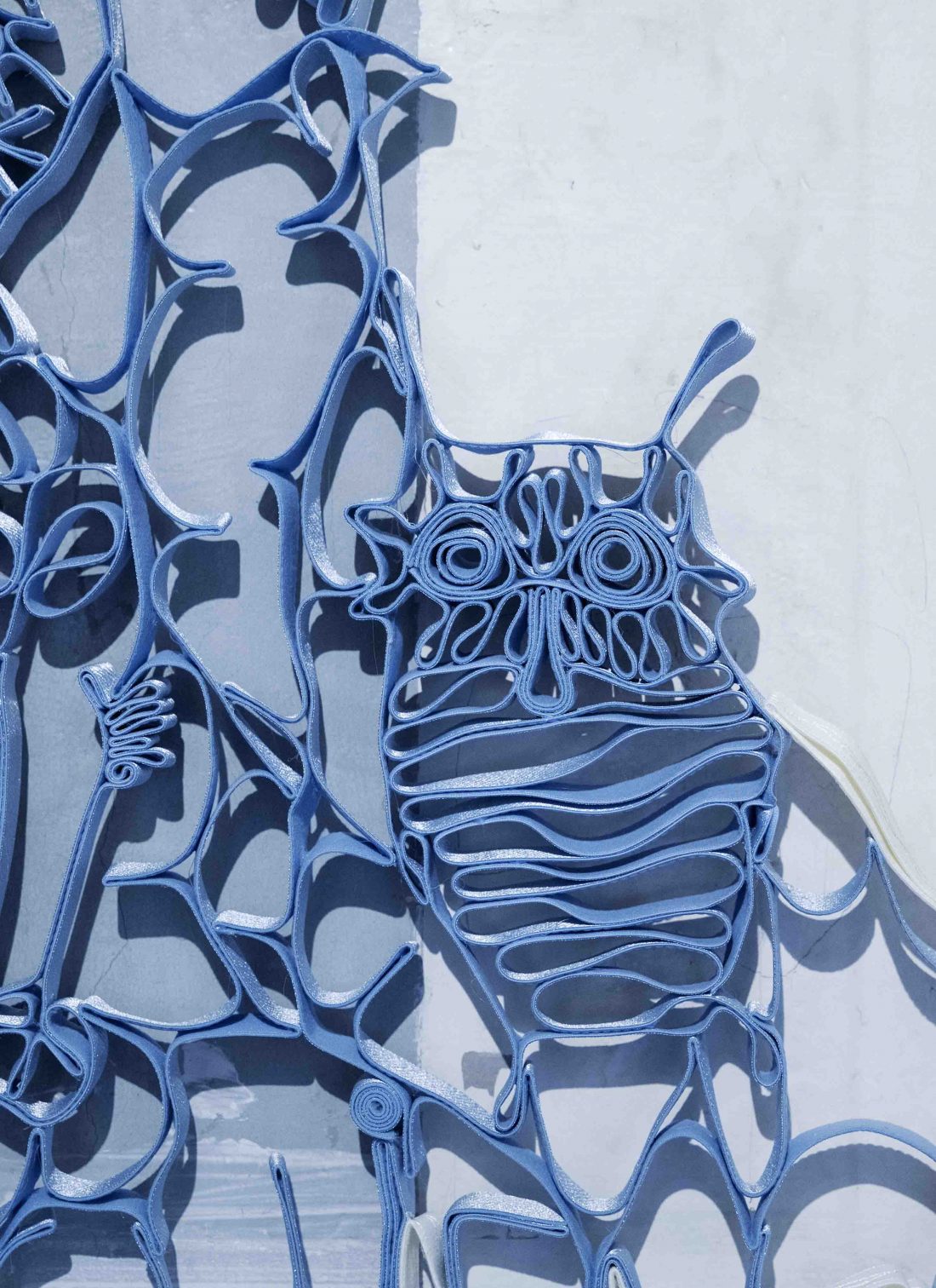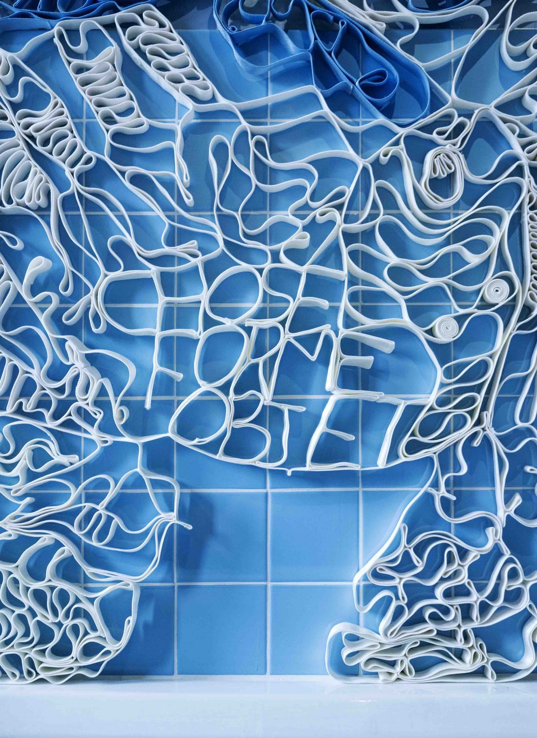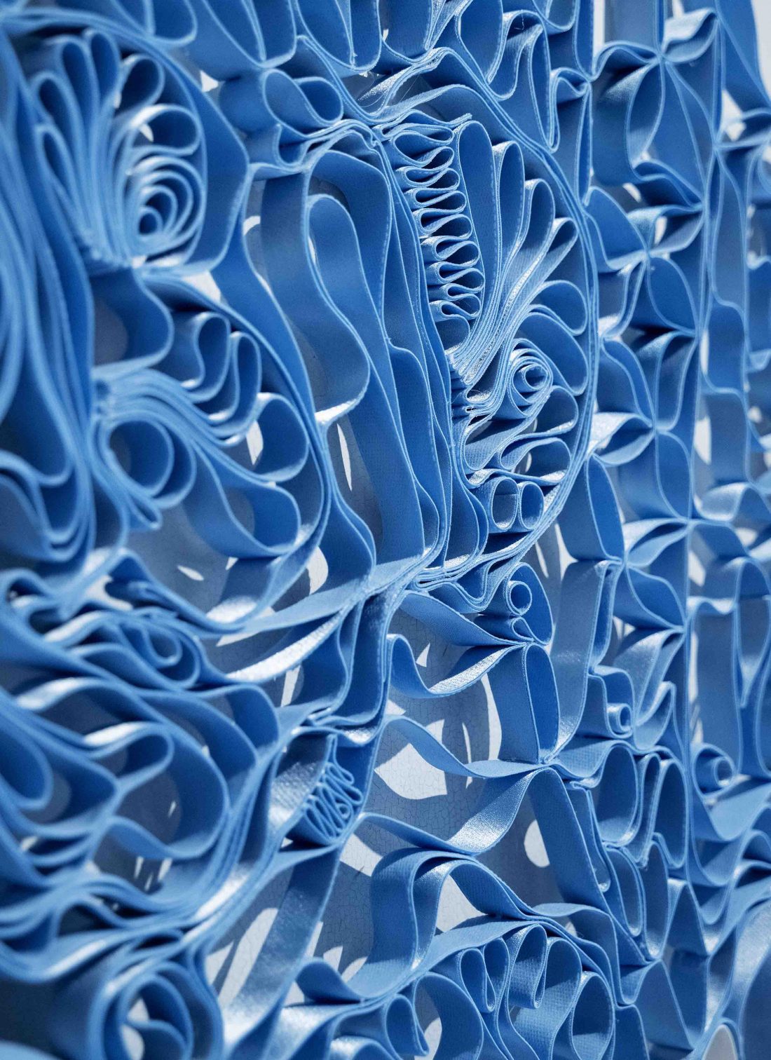 Pour l’exposition, j’ai ourlé et enroulé sur les murs laissés visibles des plis et replis de paperolles reliquaire en une matrice psychique à mémoires de formes où l’on peut reconnaitre corps, lettres, blagues. C’est presque moi.