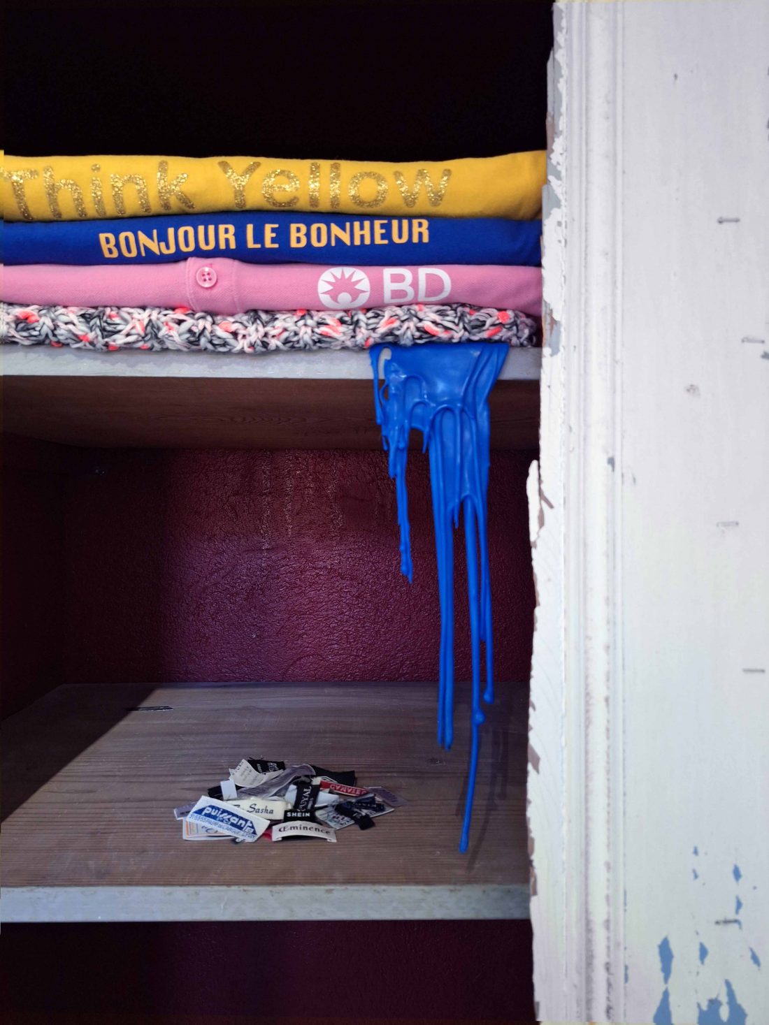 Au placard, des habits bien suspendus offrent leur spectacle anatomique. Petit décor, petit monde, qui mène à quoi ? Je cherche encore, dans les strates vestimentaires comme des phases de vie à géométrie variable, récits de jour, récits de nuit.